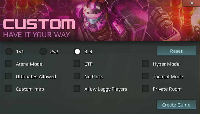 - Custom: Create your own specifications in 1v1, 2v2 or 3v3 PvP and invite your friends to play with crazy rule sets or on custom player-created maps.