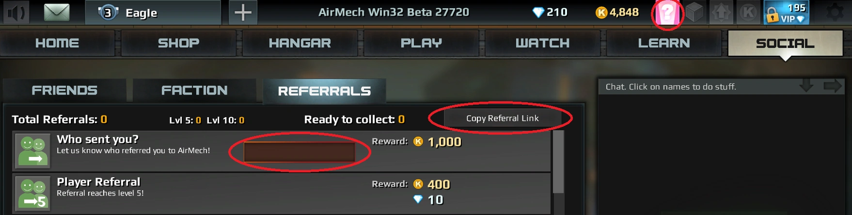Simply login to AirMech, click the Social tab and navigate to Referrals. Click the Copy Referral Link and send this hyperlink code to friends who have yet to sign up.